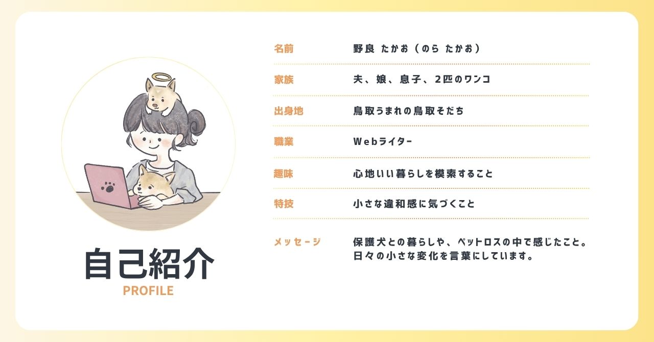 ペットロスと保護犬との暮らしをきっかけに、「同じように悩んでいる人の心が少しでも軽くなるように」と思い、このブログを始めました。